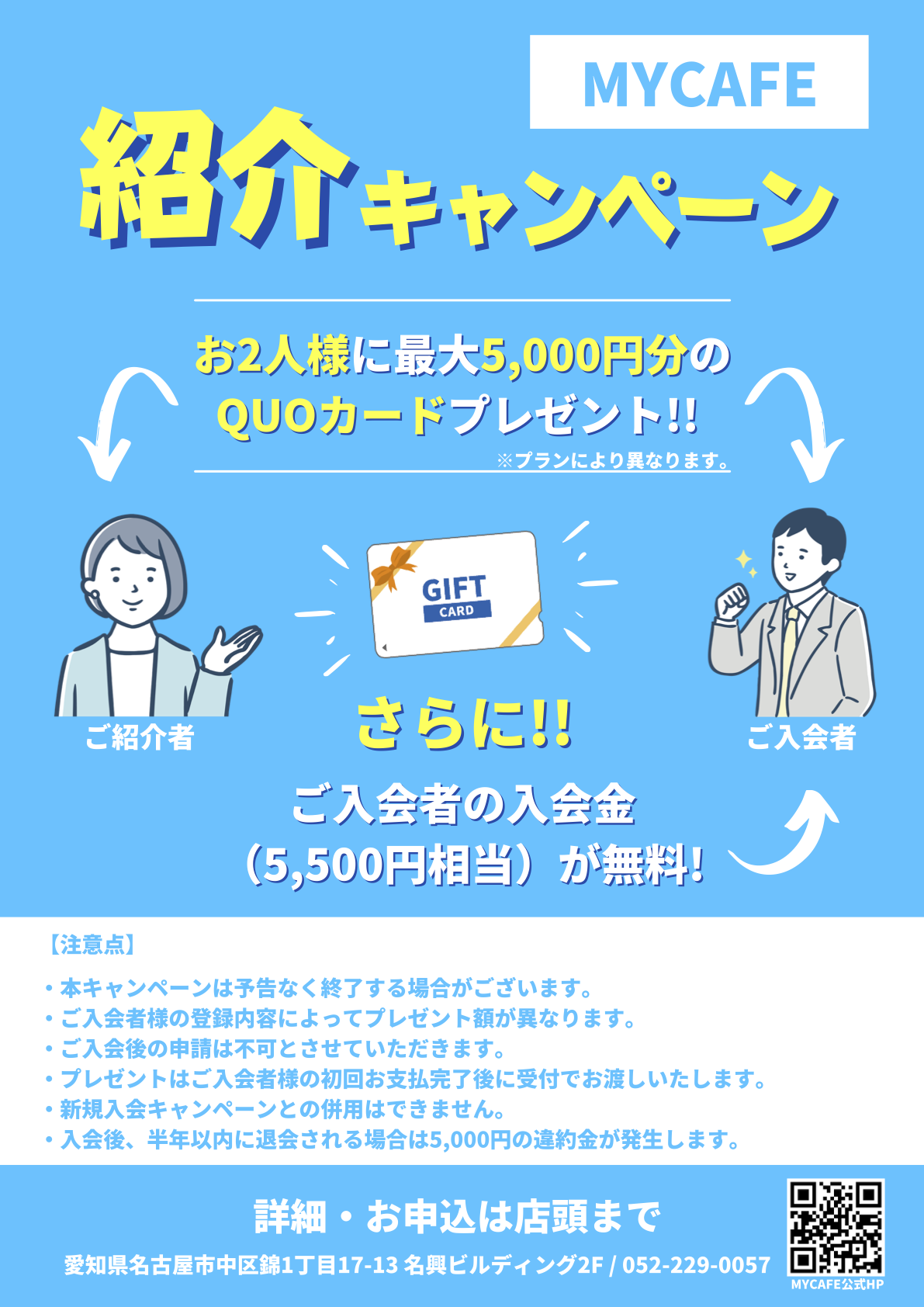 MYCAFE 名古屋最大級コワーキングスペース一歩、足を踏み入れるとそこは別世界。 仕事に集中したいあなたも、ゆっくりした時間を過ごしたいあなたも、仲間と楽しく話したいあなたも、目的や気分に合わせてお席をお選びください。 完全個室のミーティングルーム・セミナールームもご用意してます。 名古屋最大級コワーキングスペース一歩、足を踏み入れるとそこは別世界。 仕事に集中したいあなたも、ゆっくりした時間を過ごしたいあなたも、仲間と楽しく話したいあなたも、目的や気分に合わせてお席をお選びください。 完全個室のミーティングルーム・セミナールームもご用意してます。 名古屋最大級コワーキングスペース一歩、足を踏み入れるとそこは別世界。 仕事に集中したいあなたも、ゆっくりした時間を過ごしたいあなたも、仲間と楽しく話したいあなたも、目的や気分に合わせてお席をお選びください。 完全個室のミーティングルーム・セミナールームもご用意してます。 -MYCAFE NEWS- 営業時間変更のお知らせ営業時間変更のお知らせ-----【お知らせ】 平素格別のご高配を賜り厚く御礼申し上げます。 誠に勝手ではございますが、9月18日(木)は 営業時間を短縮させて頂きます。 ■営業時間 2025年9月18日(木) 17時30分までの営業 […] もっと読む【重要】マイカフェ 光熱費に関するお知らせ【重要】マイカフェ 光熱費に関するお知らせ-----平素は施設をご利用くださりありがとうございます。 昨今の電気料金を始めとする諸物価の急激な高騰により、自助努力だけではコスト増を吸収できない状況となりました。 つきましては、甚だ不本意ではございますが […] もっと読む求人募集!求人募集!-----こんにちは!現在マイカフェでは受付スタッフを大募集しております! 「人と話すのがとにかく好き」「コワーキングスペースの運営に興味がある」「新しく楽しいことに興味がある」「今までと違った仕事がしたい」 […] もっと読む初回内覧にお越しの皆さまへ!初回内覧にお越しの皆さまへ!-----こんにちは! 名古屋最大級のコワーキングスペースMYCAFEです! 今回は初めて […] Read more3Fミニセミナールーム誕生!3Fミニセミナールーム誕生!-----3F窓側の個室に「ミニセミナールーム」が誕生します! 窓からは公園の緑が見え、開放感あふれるスペースとなっております。 セミナーや会議、研修、ワークスペースなどにご活用ください。 MYCAFE 3Fミ […] Read more【Zoom部屋】始まります!【Zoom部屋】始まります!いつもマイカフェをご利用いただき誠にありがとうございます。 今回は5月1日からスタートする【Zoom部屋】についてご案内いたします! 窓際の個室となっておりますので、Zoomだけではなく、集中して作業 […] Read more紹介キャンペーン!紹介キャンペーン!-----こんにちは!MYCAFE受付スタッフです^ ^ 今回は8/1からスタートの、MY […] Read more 営業時間変更のお知らせ【お知らせ】 平素格別のご高配を賜り厚く御礼申し上げます。 誠に勝手ではございますが、9月18日(木)は 営業時間を短縮させて頂きます。 ■営業時間 2025年9月18日(木) 17時30分までの営業 […]【重要】マイカフェ 光熱費に関するお知らせ平素は施設をご利用くださりありがとうございます。 昨今の電気料金を始めとする諸物価の急激な高騰により、自助努力だけではコスト増を吸収できない状況となりました。 つきましては、甚だ不本意ではございますが […]求人募集!こんにちは!現在マイカフェでは受付スタッフを大募集しております! 「人と話すのがとにかく好き」「コワーキングスペースの運営に興味がある」「新しく楽しいことに興味がある」「今までと違った仕事がしたい」 […]初回内覧にお越しの皆さまへ!こんにちは! 名古屋最大級のコワーキングスペースMYCAFEです! 今回は初めて […]3Fミニセミナールーム誕生!3F窓側の個室に「ミニセミナールーム」が誕生します! 窓からは公園の緑が見え、開放感あふれるスペースとなっております。 セミナーや会議、研修、ワークスペースなどにご活用ください。 MYCAFE 3Fミ […]【Zoom部屋】始まります!いつもマイカフェをご利用いただき誠にありがとうございます。 今回は5月1日からスタートする【Zoom部屋】についてご案内いたします! 窓際の個室となっておりますので、Zoomだけではなく、集中して作業 […]紹介キャンペーン!こんにちは!MYCAFE受付スタッフです^ ^ 今回は8/1からスタートの、MY […] -MYCAFE BLOG- 【在宅】だと捗らないワケ 2025年9月15日2025年8月6日 昨今、新型コロナウイルスの関係で在宅ワークやテレワークなどに… more ワーケーションの普及は難しい? 2025年8月15日2025年6月12日 そもそも「ワーケーション」とは? 「ワーケーション」という言… more フリーランスこそ地方へ 2025年7月15日2025年6月12日 IT関係のフリーランスの需要がある 就職するために都内や大都… more リモートワークについて 2025年6月15日2025年6月12日 リモートワークでの生産性が世界最下位の日本、その要因は? 過… more シェアオフィスとは? 20